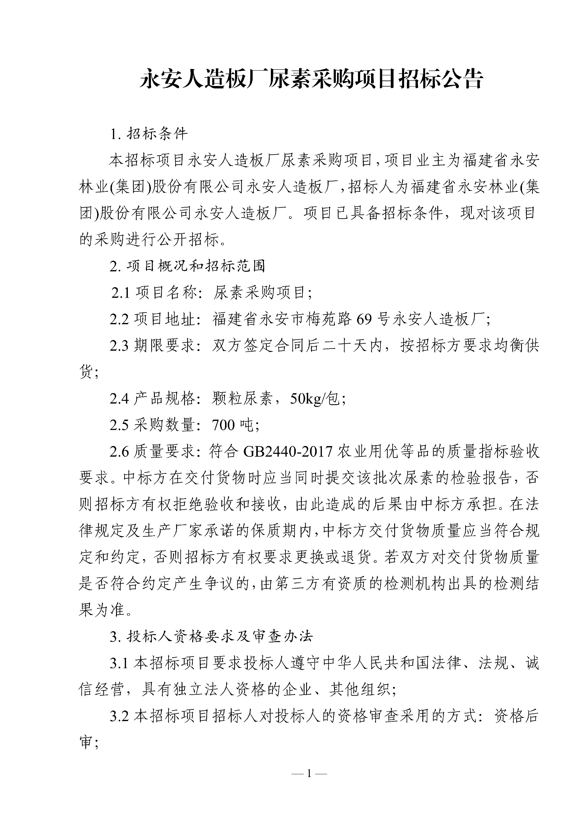 永安人造板廠尿素采購項(xiàng)目招標(biāo)公告