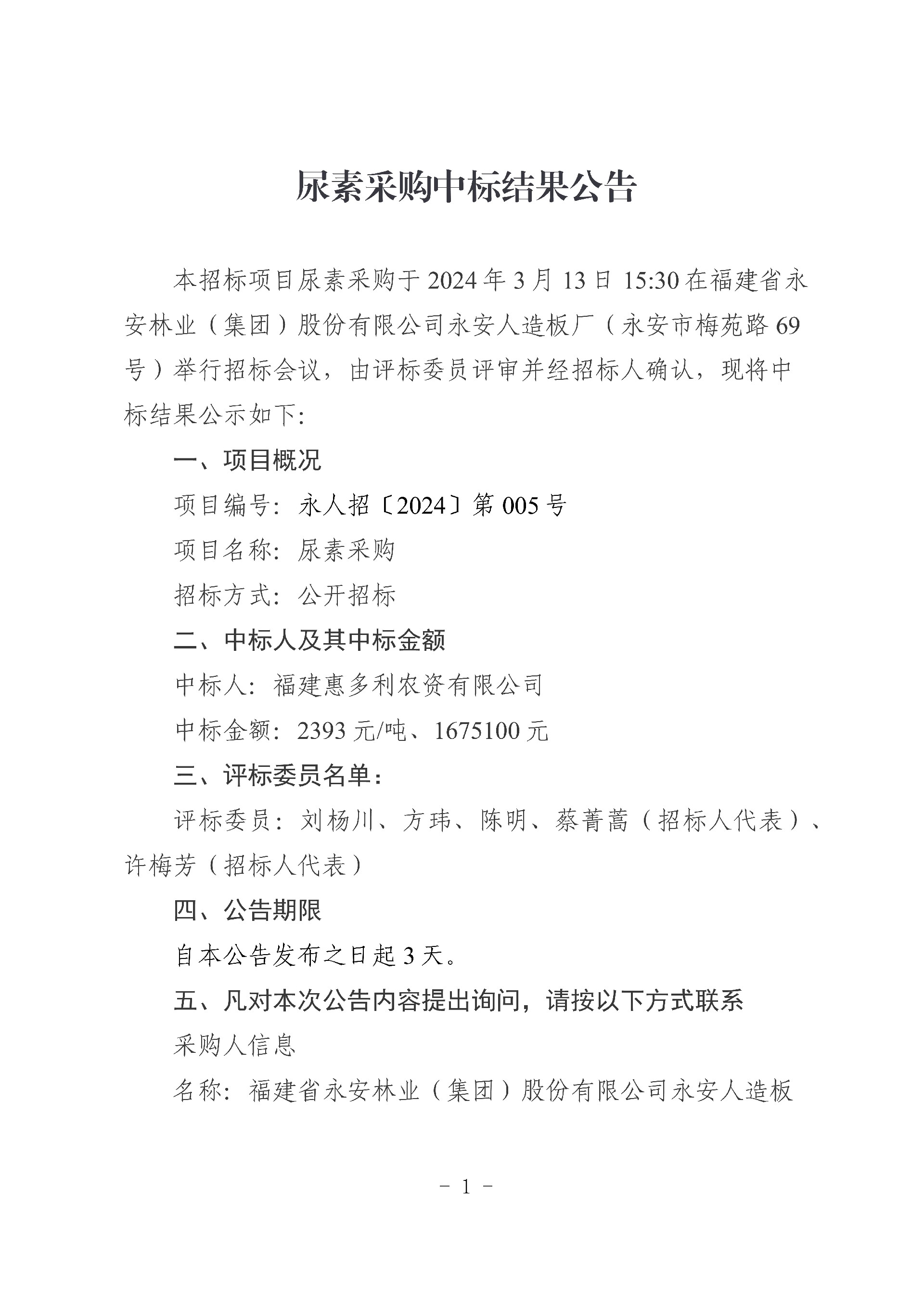 永安人造板廠尿素采購項(xiàng)目中標(biāo)結(jié)果公告