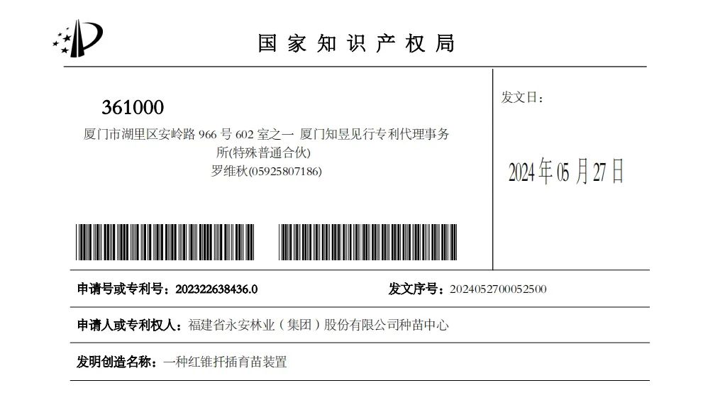 近日,永安林業(yè)所屬種苗中心《一種木莢紅豆育苗裝置》《一種紅錐扦插育苗裝置》2項實用新型專利獲得國家知識產(chǎn)權(quán)局授權(quán)。2項專利實用性強、應(yīng)用領(lǐng)域廣,可有效提高育苗效率和苗木質(zhì)量,為永安林業(yè)加強珍貴樹種培育進一步提供技術(shù)支撐。