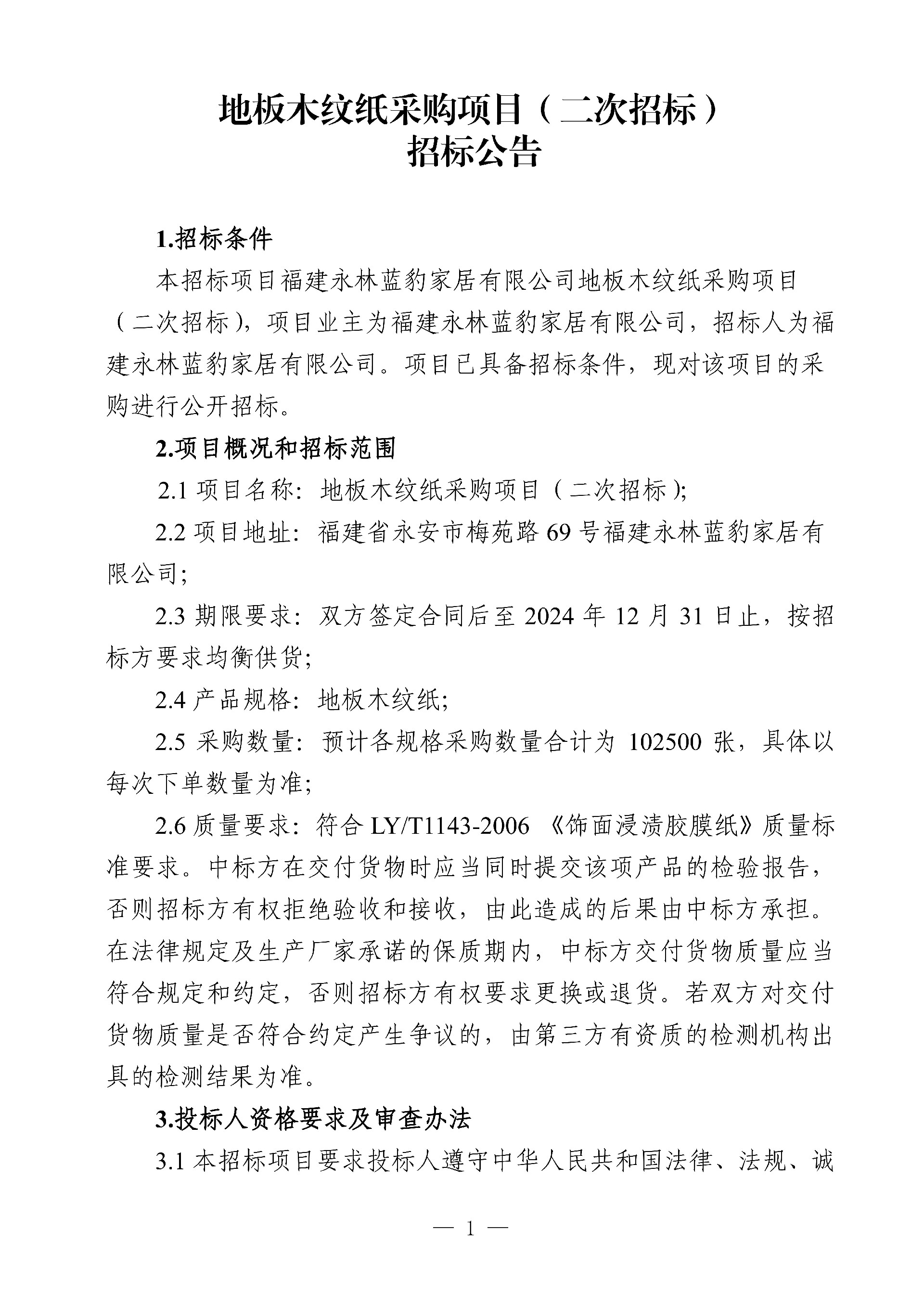 福建永林藍(lán)豹家居有限公司地板木紋紙采購項目(二次招標(biāo)) 招標(biāo)公告