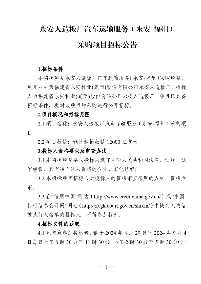 永安人造板廠汽車(chē)運(yùn)輸服務(wù)(永安-福州) 采購(gòu)項(xiàng)目招標(biāo)公告