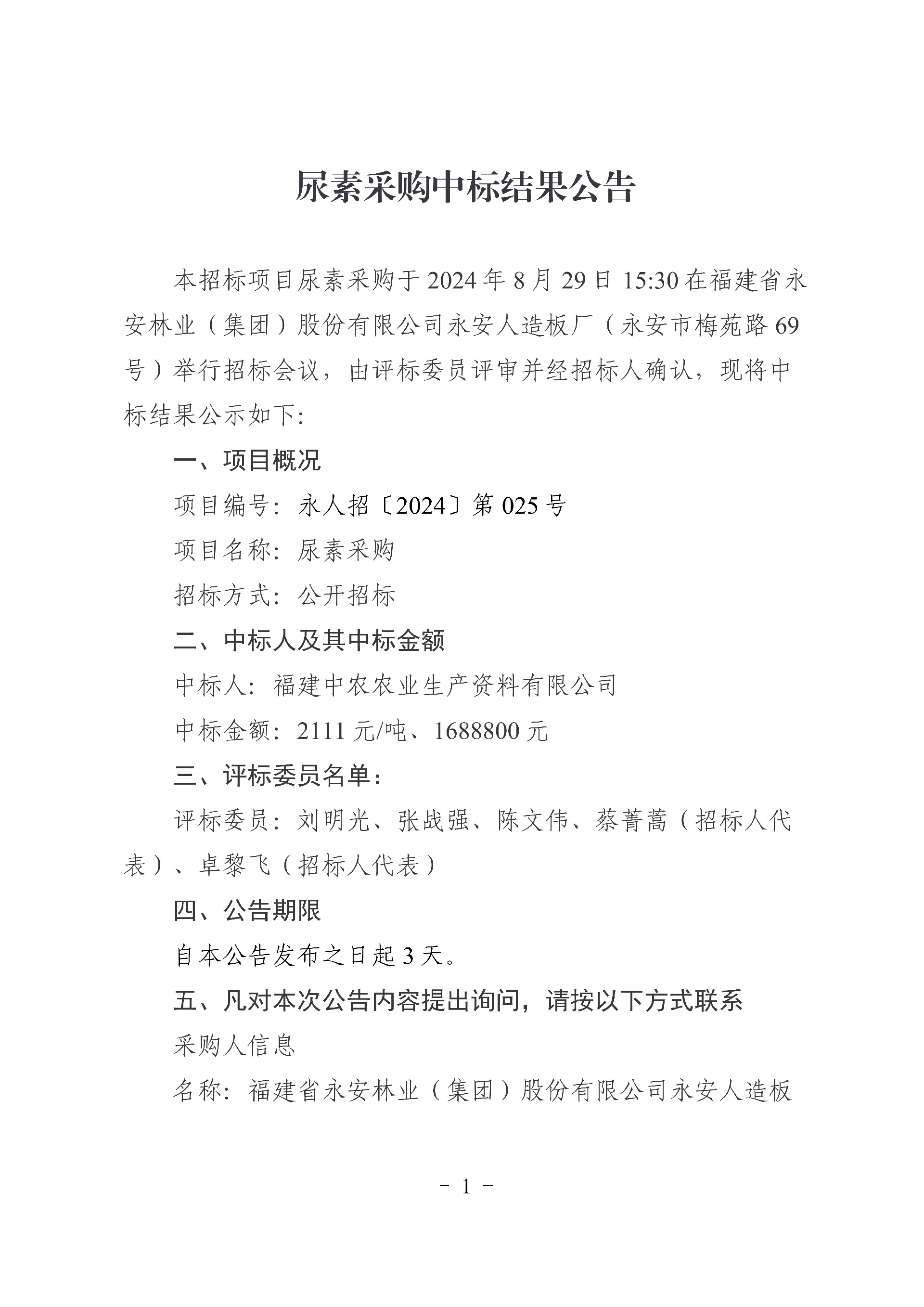 永安人造板廠尿素采購(gòu)中標(biāo)結(jié)果公告