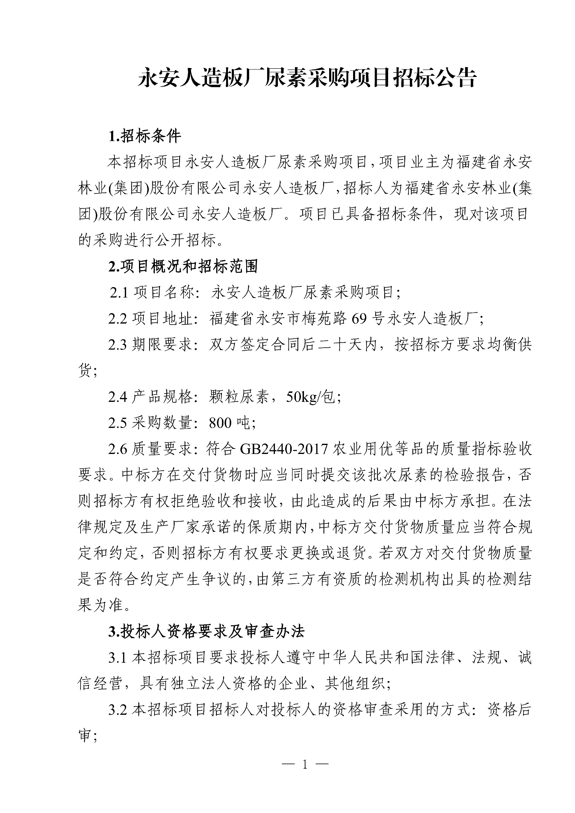 永安人造板廠尿素采購項目中標(biāo)結(jié)果公告