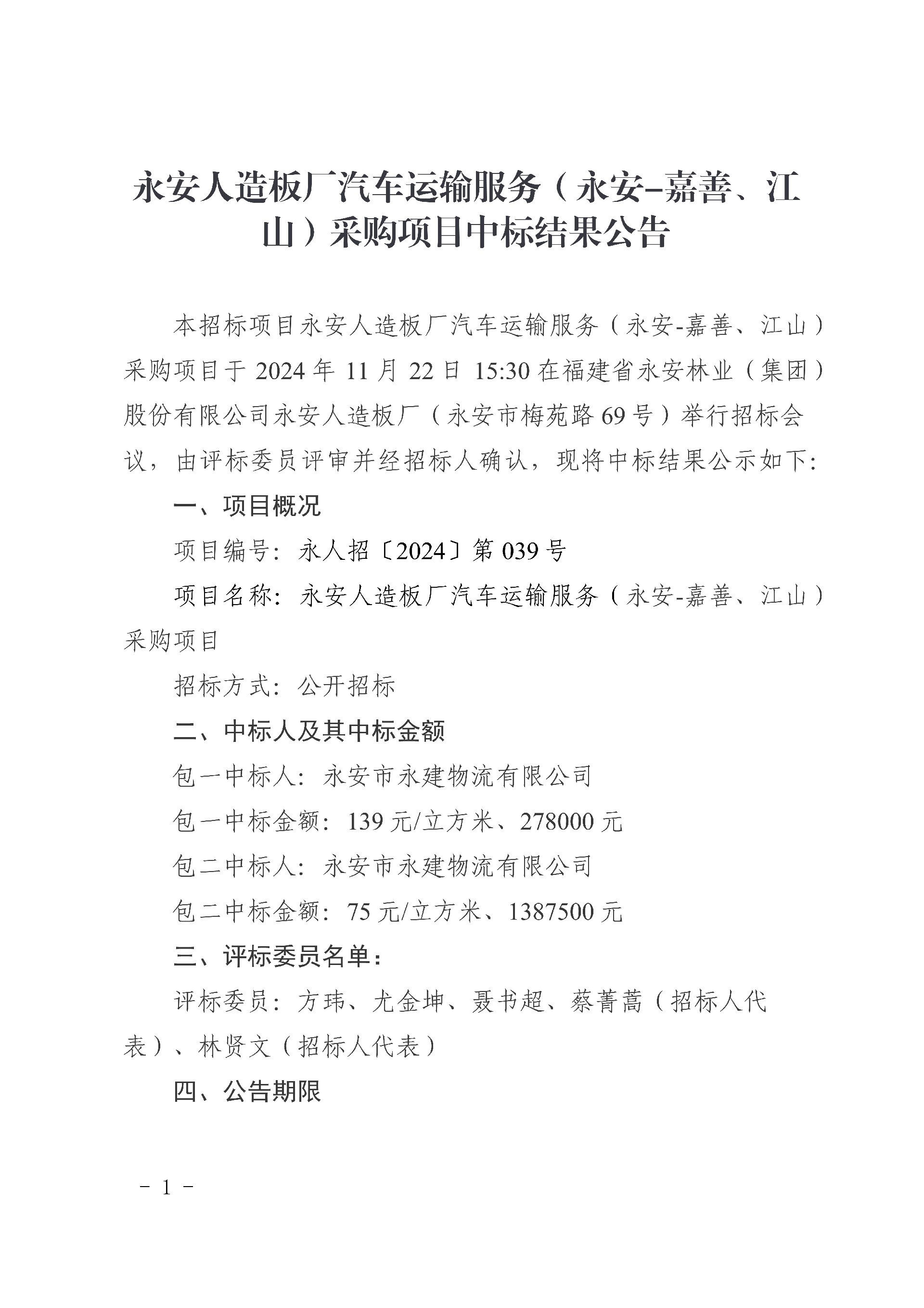 永安人造板廠汽車運輸服務(wù)(永安-嘉善、江山)采購項目中標結(jié)果公告