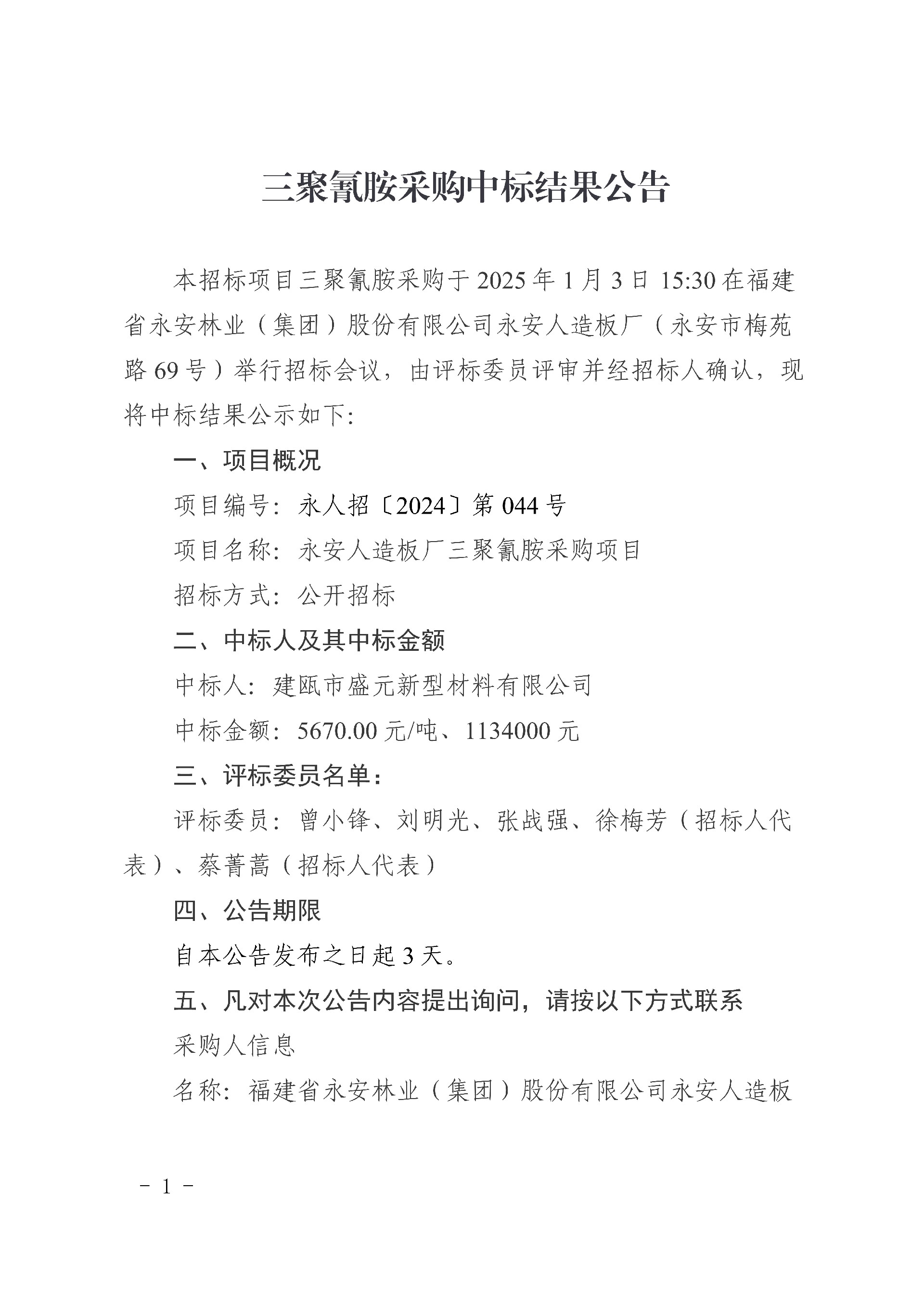 永安人造板廠三聚氰胺采購中標(biāo)結(jié)果公告