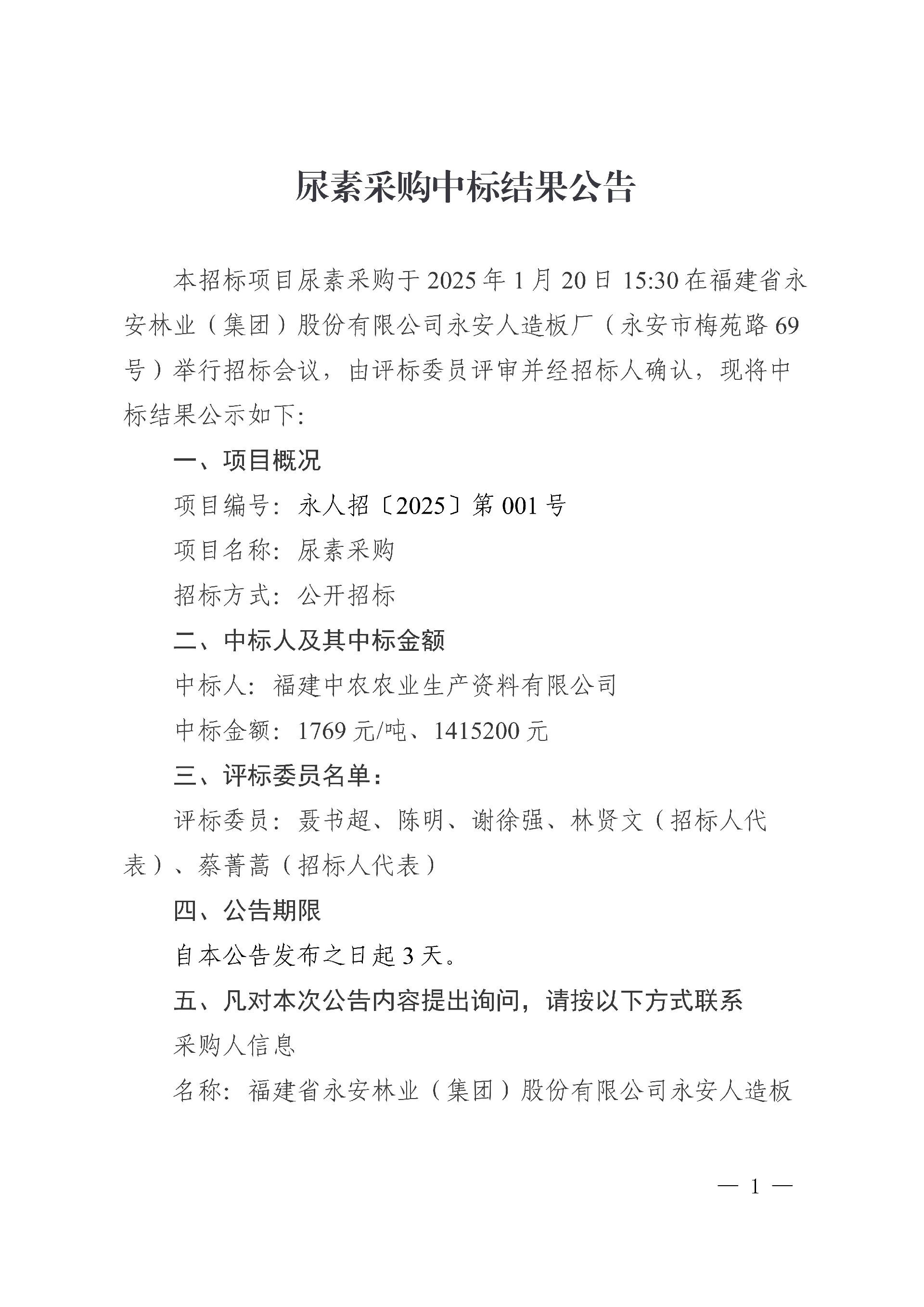 永安人造板廠尿素采購項目中標結(jié)果公告