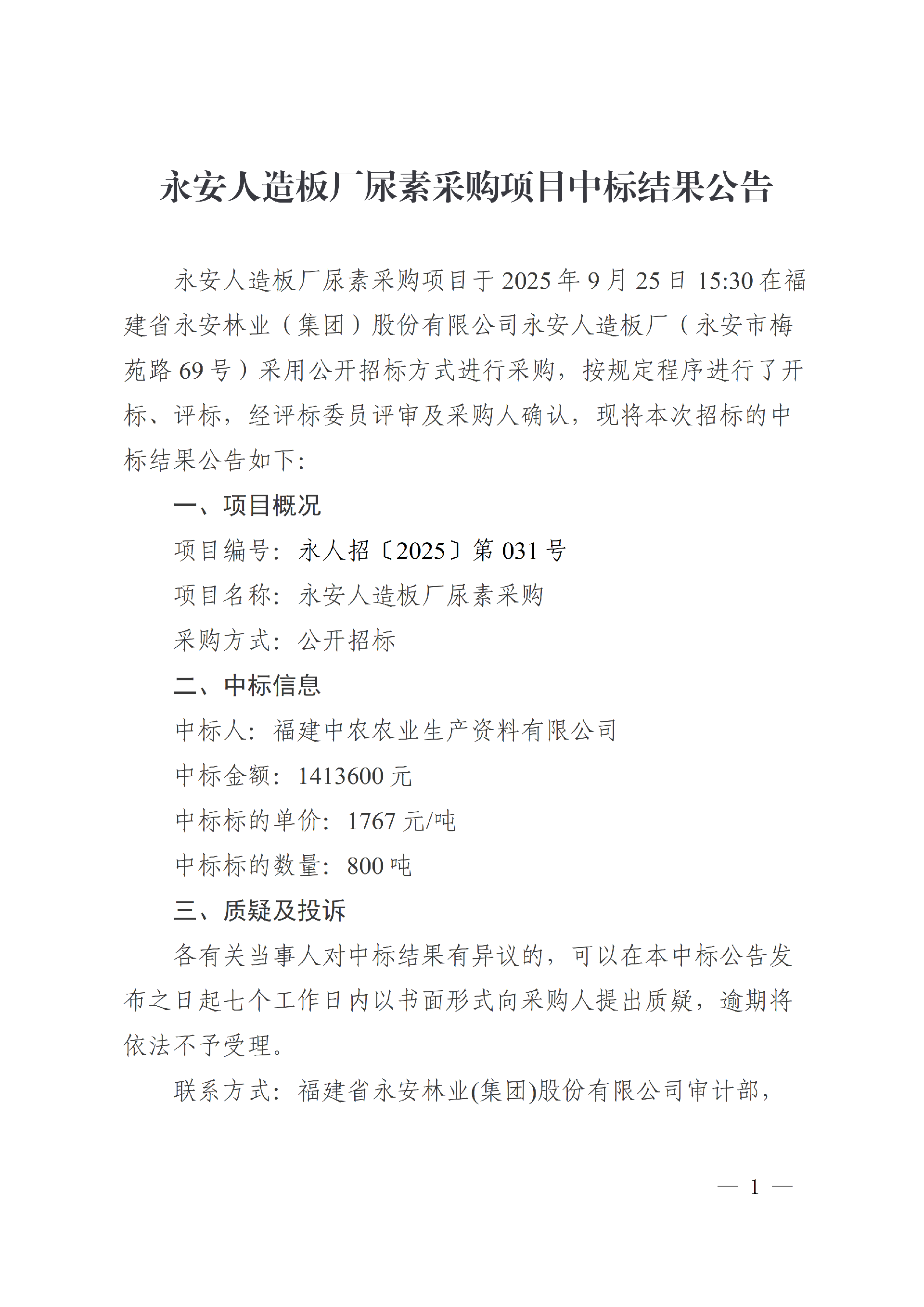 永安人造板廠尿素采購(gòu)項(xiàng)目中標(biāo)結(jié)果公告