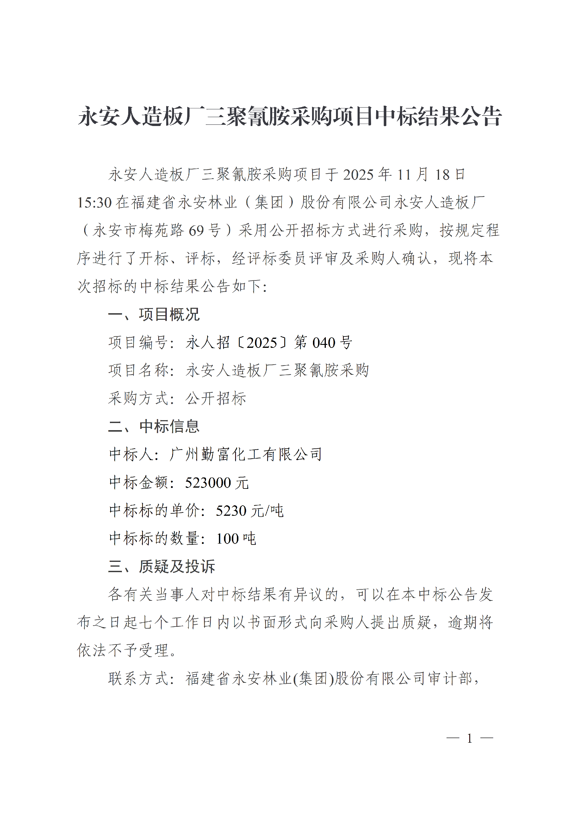 永安人造板廠三聚氰胺采購項目中標結(jié)果公告