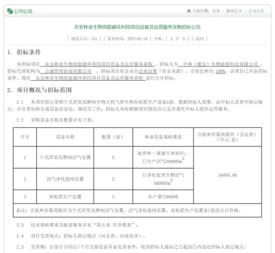 1月20日,永安林業(yè)生物質能循環(huán)利用項目設備及運營服務招標正式發(fā)售,這標志著公司生物質能源項目由研究論證階段正式進入項目投資階段,公司向高質量綠色發(fā)展邁出了關鍵一步。
