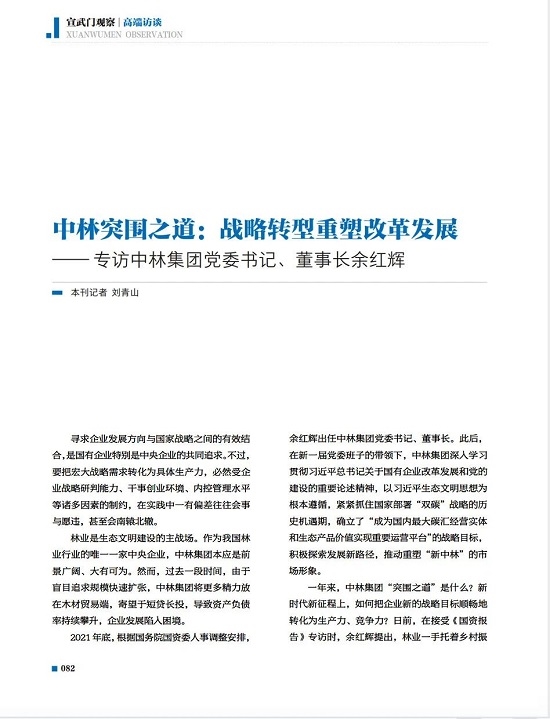 2021年底,根據(jù)國務院國資委人事調整安排,余紅輝出任中林集團黨委書記、董事長。此后,在新一屆黨委班子的帶領下,中林集團深入學習貫徹習近平總書記關于國有企業(yè)改革發(fā)展和黨的建設的重要論述精神,以習近平生態(tài)文明思想為根本遵循,緊緊抓住國家部署“雙碳”戰(zhàn)略的歷史機遇期,確立了“成為國內最大碳匯經(jīng)營實體和生態(tài)產(chǎn)品價值實現(xiàn)重要運營平臺”的戰(zhàn)略目標,積極探索發(fā)展新路徑,推動重塑“新中林”的市場形象。